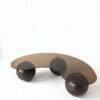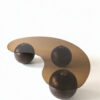 שולחן סלון אמנותי ומסקרן המשלב פלטת זכוכית מעושנת עם רגליים כדוריות במראה עץ.