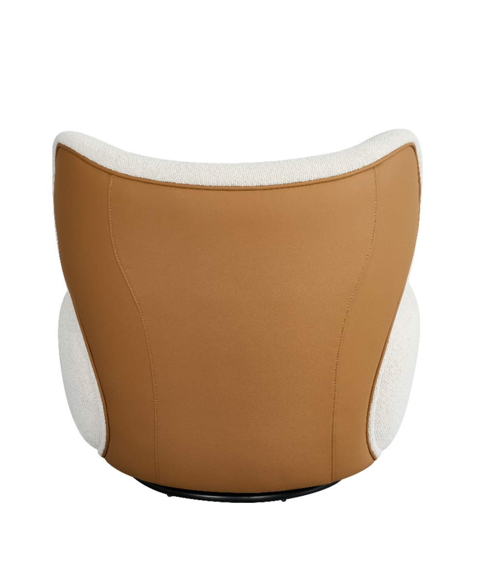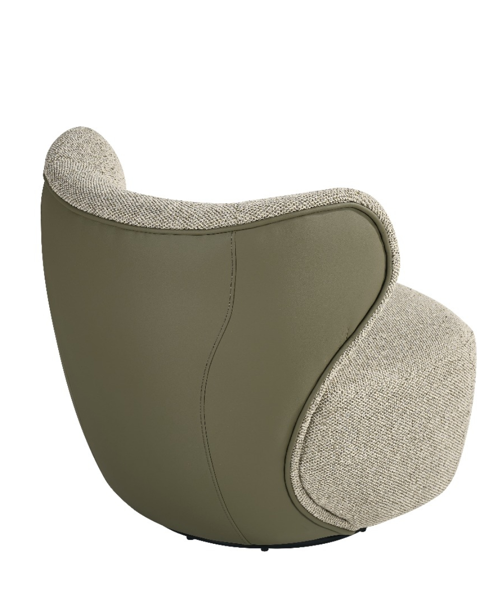 כורסא מסתובבת עם ישיבה סופר נוחה, מרופדת בבדים ארוגים איכותיים ומשענת גב דמוי-עור המוסיפה טאץ’ אלגנטי ומודרני.