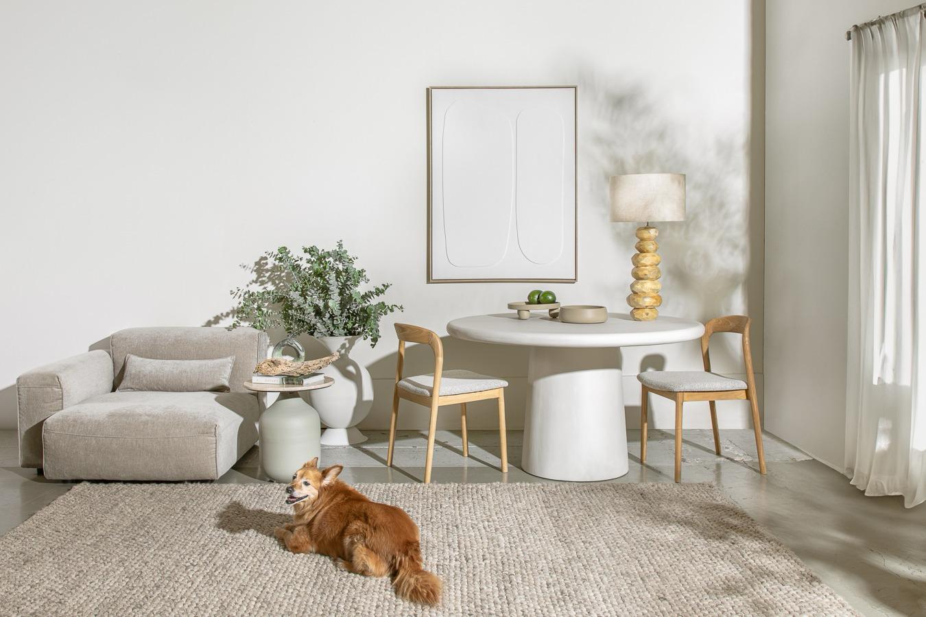 המעוצבת מרגל אבני עץ אמורפיות בצבע בז’ ואהיל אובאלי עשוי פשתן בצבע טבעי.
